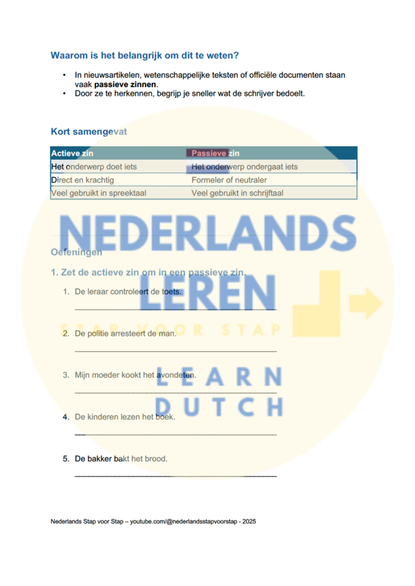 Met dit oefenblad leren cursisten stap voor stap het verschil tussen actieve en passieve zinnen in het Nederlands. Ze ontdekken hoe het onderwerp in actieve zinnen de handeling uitvoert en in passieve zinnen deze ondergaat, inclusief het gebruik van het lijdend voorwerp en hulpmiddelen zoals 'worden'.